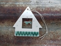 A hand rolled & cut porcelain decoration. The decoration is embossed and glazed and is available with green or red beads. Each decoration is adorned with my characteristic hanging porcelain bird. Decorations are presented beautifully in a recycled box. The box measures 9cm x 9cm.